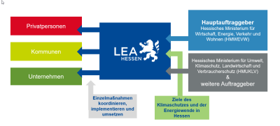 Die Angebote der LEA Hessen richten sich an hessische Bürgerinnen und Bürger, gesellschaftliche Organisationen, Kommunen und Unternehmen. Die LEA Hessen bietet Informationen, Erstberatungen und begleitende Unterstützung bei der Auswahl und Umsetzung von Maßnahmen zum Klimaschutz, zur Energieeffizienz, zur Energieeinsparung oder zum Ausbau erneuerbarer Energien im eigenen Umfeld. Die LEA Hessen ist zuverlässige Partnerin, wenn es darum geht, Dritte für Aktivitäten für den Klimaschutz und die Energiewende zu gewinnen.